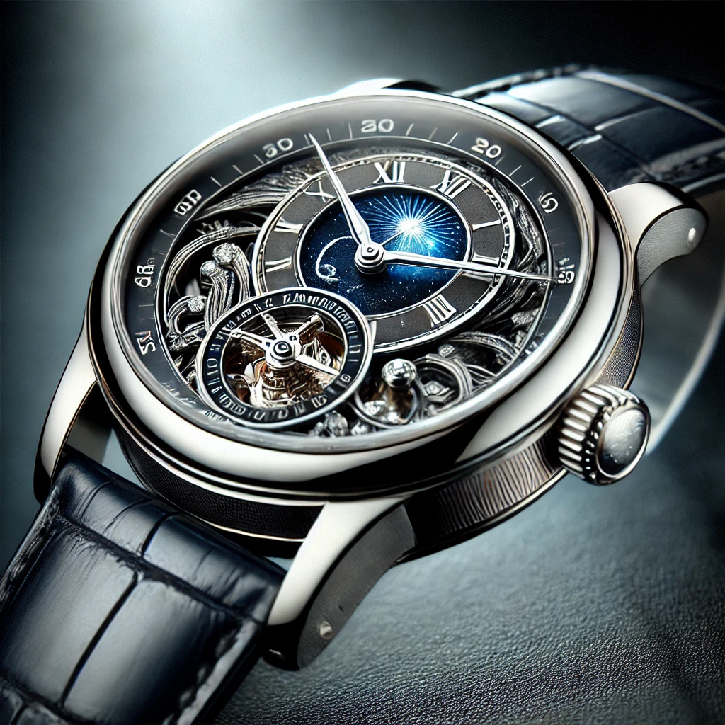 Elle présente un boîtier en platine poli avec des gravures sophistiquées, un cadran bleu nuit orné de motifs célestes et des index sertis de diamants. Son mécanisme tourbillon est visible à travers un design open-heart, renforçant son aspect exclusif. Le bracelet en cuir d’alligator bleu marine avec boucle en platine complète ce modèle raffiné. Un rendu idéal pour une boutique haut de gamme fictive.